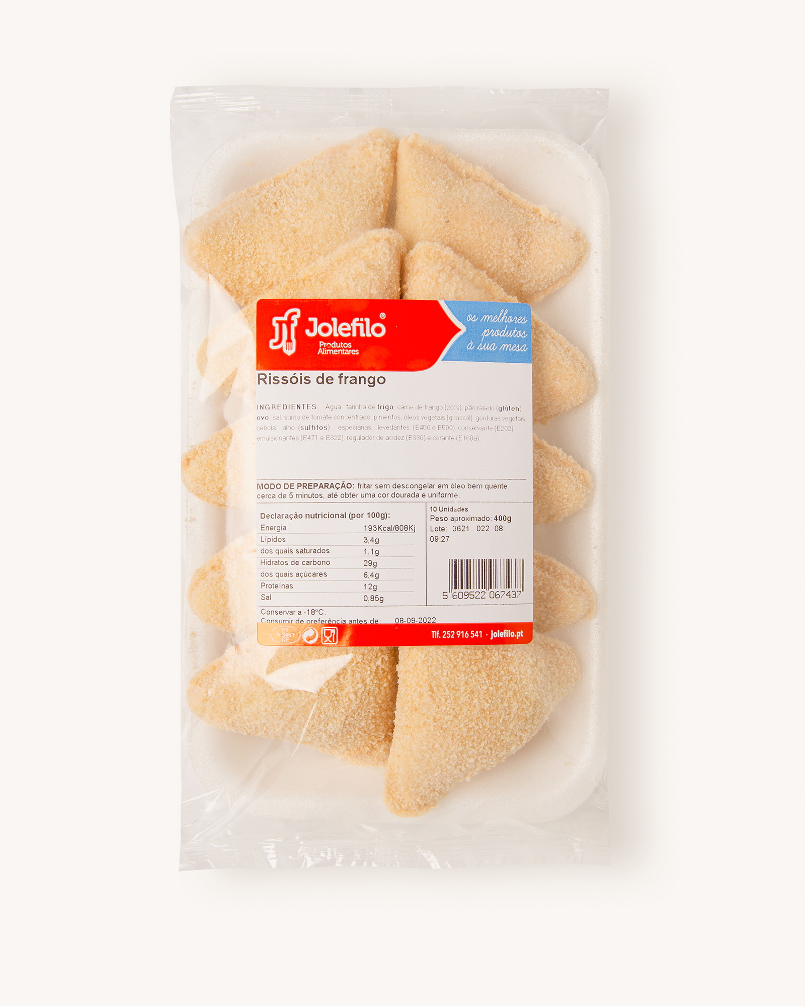 Recheio à base de frango desfiado, cebola, polpa de tomate, pimentos, sal, alho e especiarias. Massa de farinha de trigo, água, óleo vegetal, gordura vegetal e sal. Cobertura de pão ralado e ovo líquido pasteurizado.