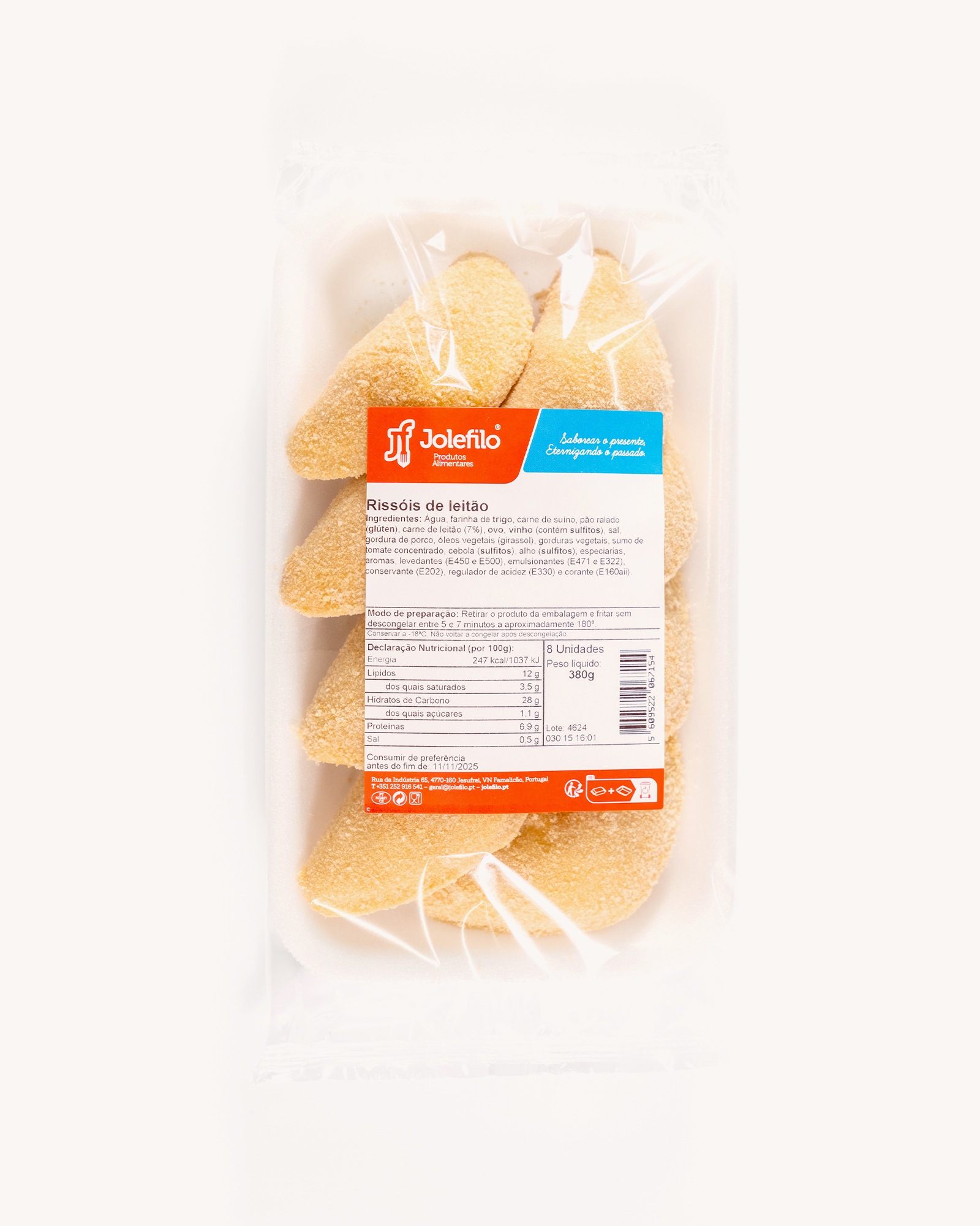 Recheio à base de carne de suíno, carne de leitão, cebola, polpa de tomate, vinho branco, molho de leitão, sal, alho e especiarias. Massa de farinha de trigo, água, óleo vegetal, gordura vegetal e sal. Cobertura de pão ralado e ovo líquido pasteurizado.